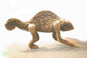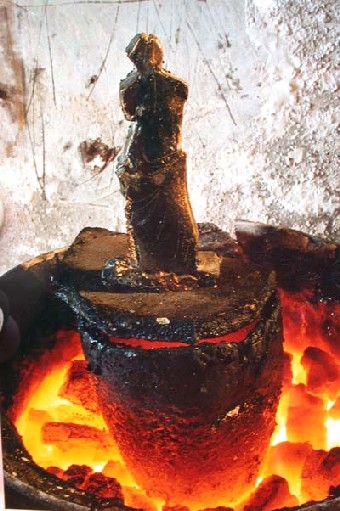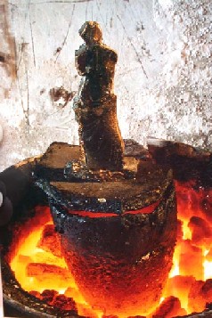 ca. 12 cm Länge. In der zweiten Wochenhälfte werden wir die Wachsplastik in Bronze giessen. Wir bauen die Gussformen aus Schamotte, schmelzen das Wachs aus und giessen den Hohlraum mit Bronze aus (Guss verlorene Form). Das Ergebnis ist eine Kleinbronze, die durch Feilen und Schleifen ihr endgültiges Erscheinungsbild erhält. |